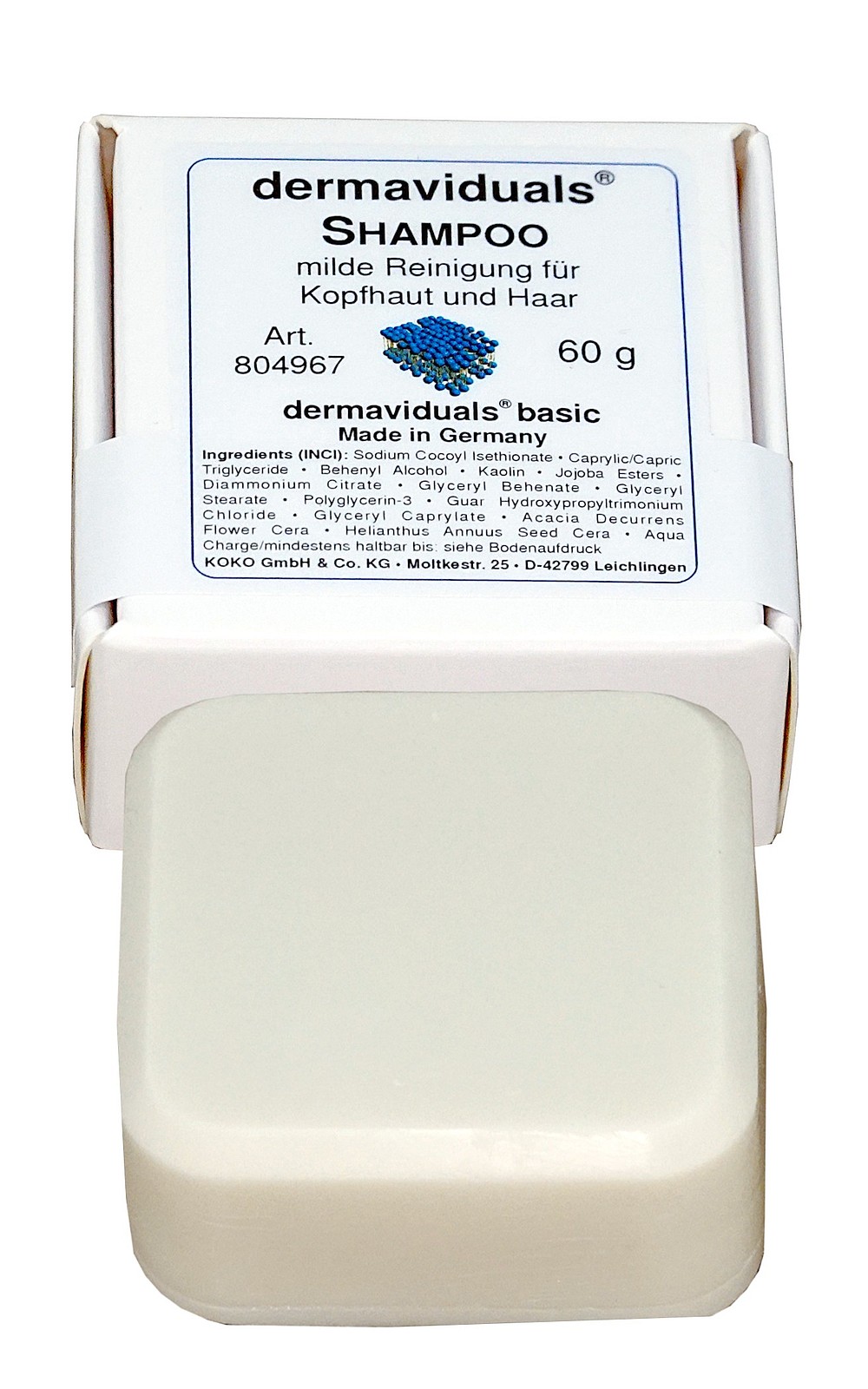 Der Shampoo-Block enthält ein biologisch vollständig abbaubares Tensid (Sodium Cocoyl Isethionate), physiologische Konsistenzgeber (Behenyl Alcohol, Glyceryl Behenate, Glyceryl Stearate, Glyceryl Caprylate) sowie das antistatisch wirkende Guar Hydroxypropyltrimonium Chloride (Naturstoff-Derivat).